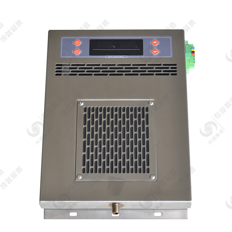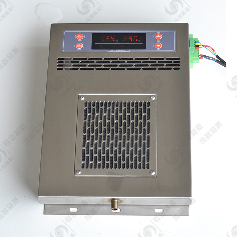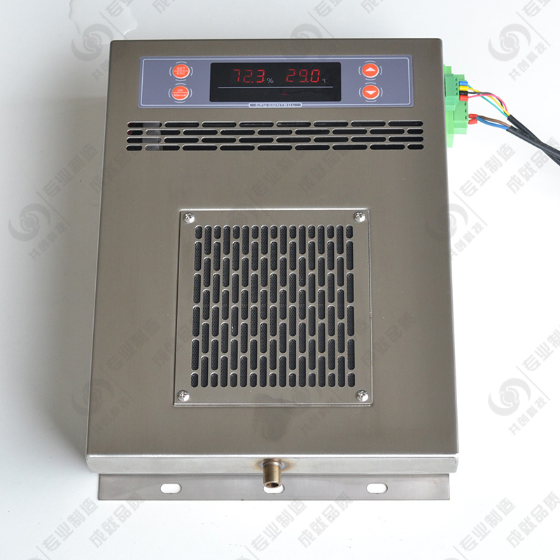 當(dāng)潮濕空氣經(jīng)風(fēng)扇吸入后,通過特別設(shè)計(jì)的風(fēng)道流動(dòng),先經(jīng)半導(dǎo)體制冷器降溫結(jié)露,制冷器的結(jié)露在重力作用下滴入引水槽,再由導(dǎo)水管流出柜外。在設(shè)定啟動(dòng)值內(nèi)經(jīng)過充分循環(huán)除濕,使柜內(nèi)空氣濕度降至結(jié)露點(diǎn)以下,完成整個(gè)防潮引凝加熱過程。同時(shí),智能型除濕裝置信號采集傳感器外置,能實(shí)時(shí)準(zhǔn)確的采集到柜內(nèi)的真實(shí)濕度,保證智能型除濕裝置在柜內(nèi)將要達(dá)到凝露條件時(shí)提前啟動(dòng)除濕。